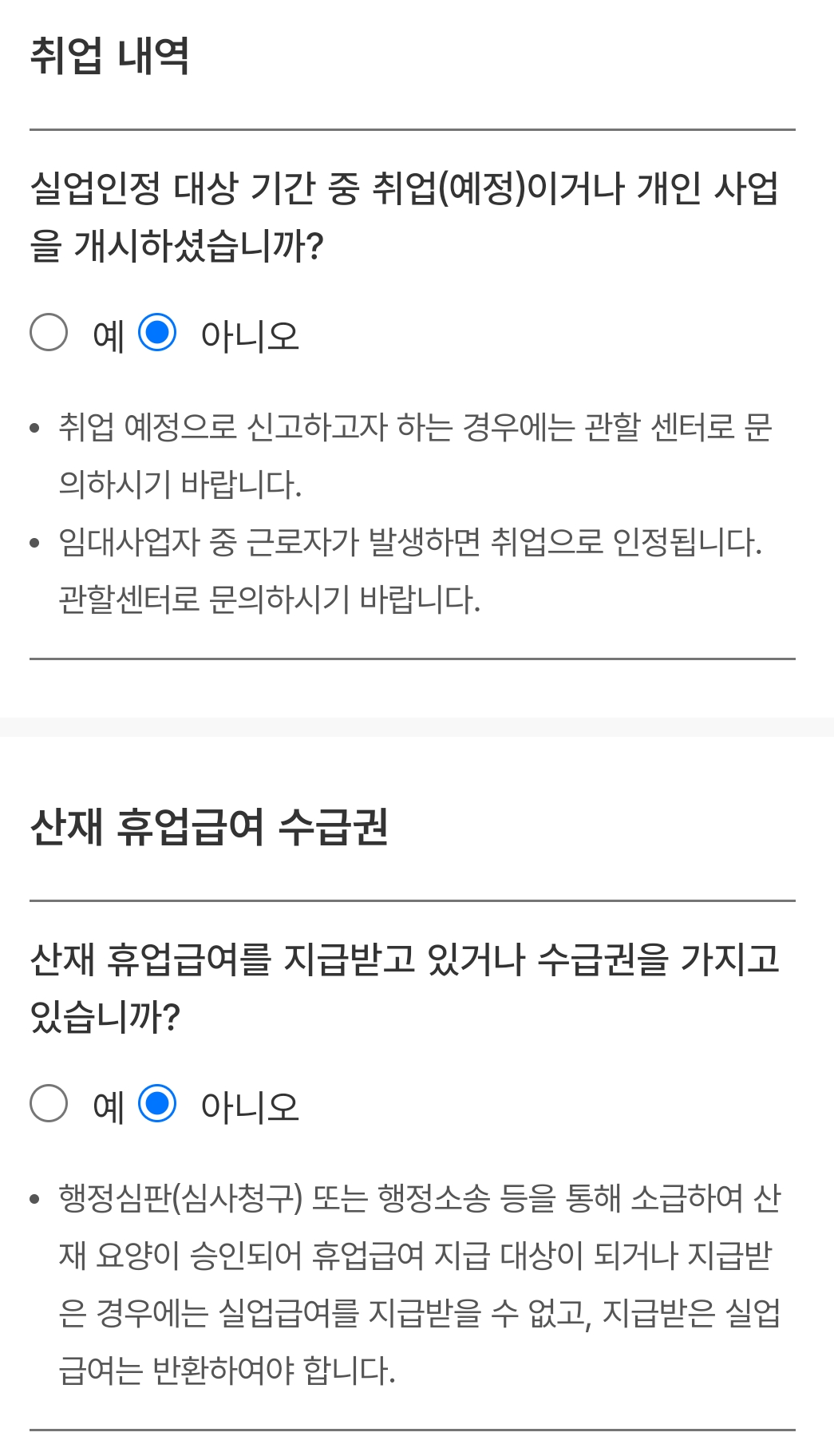 취업내역 아니오, 산재휴업급여 수급권에도 아니오 라고 선택