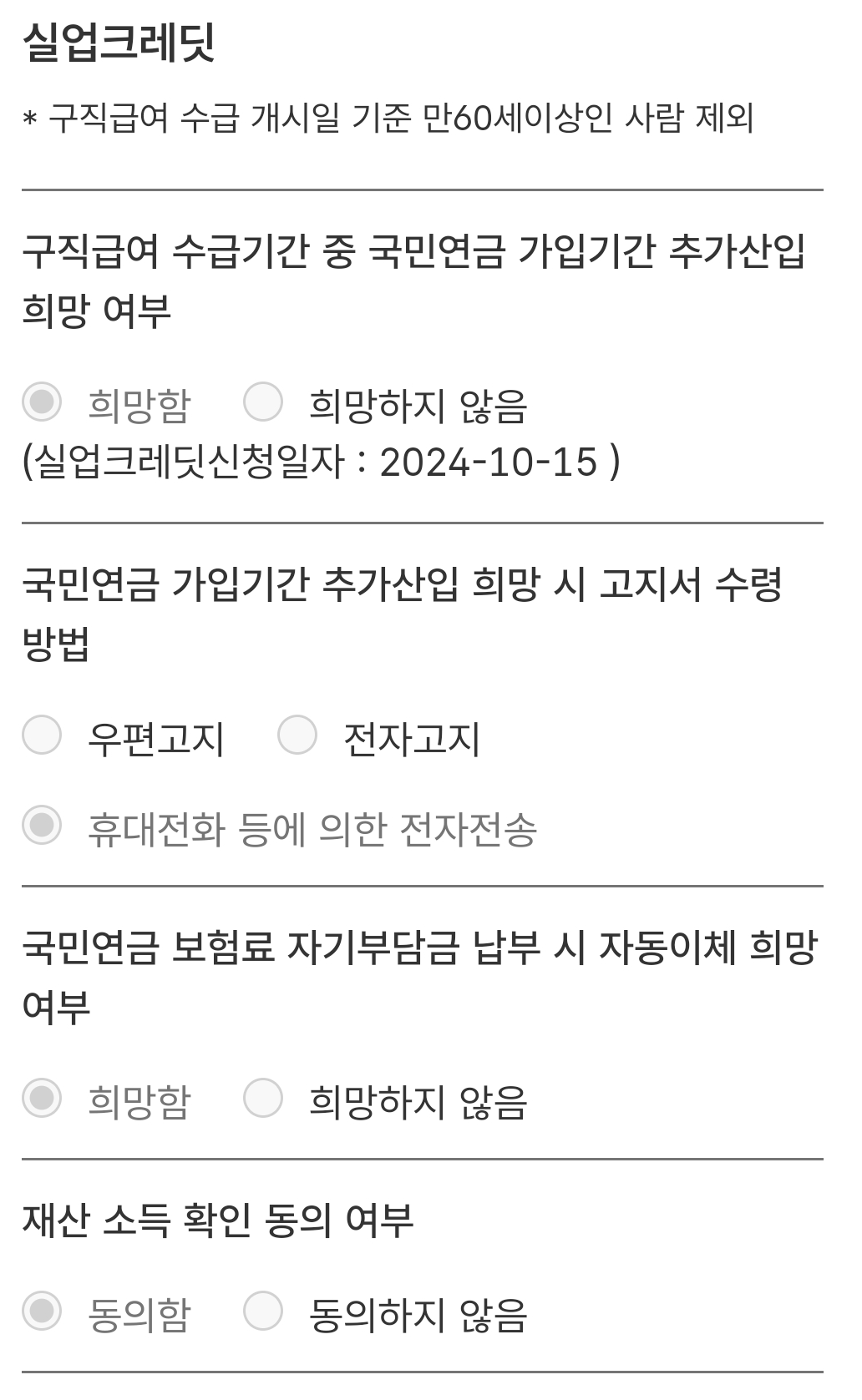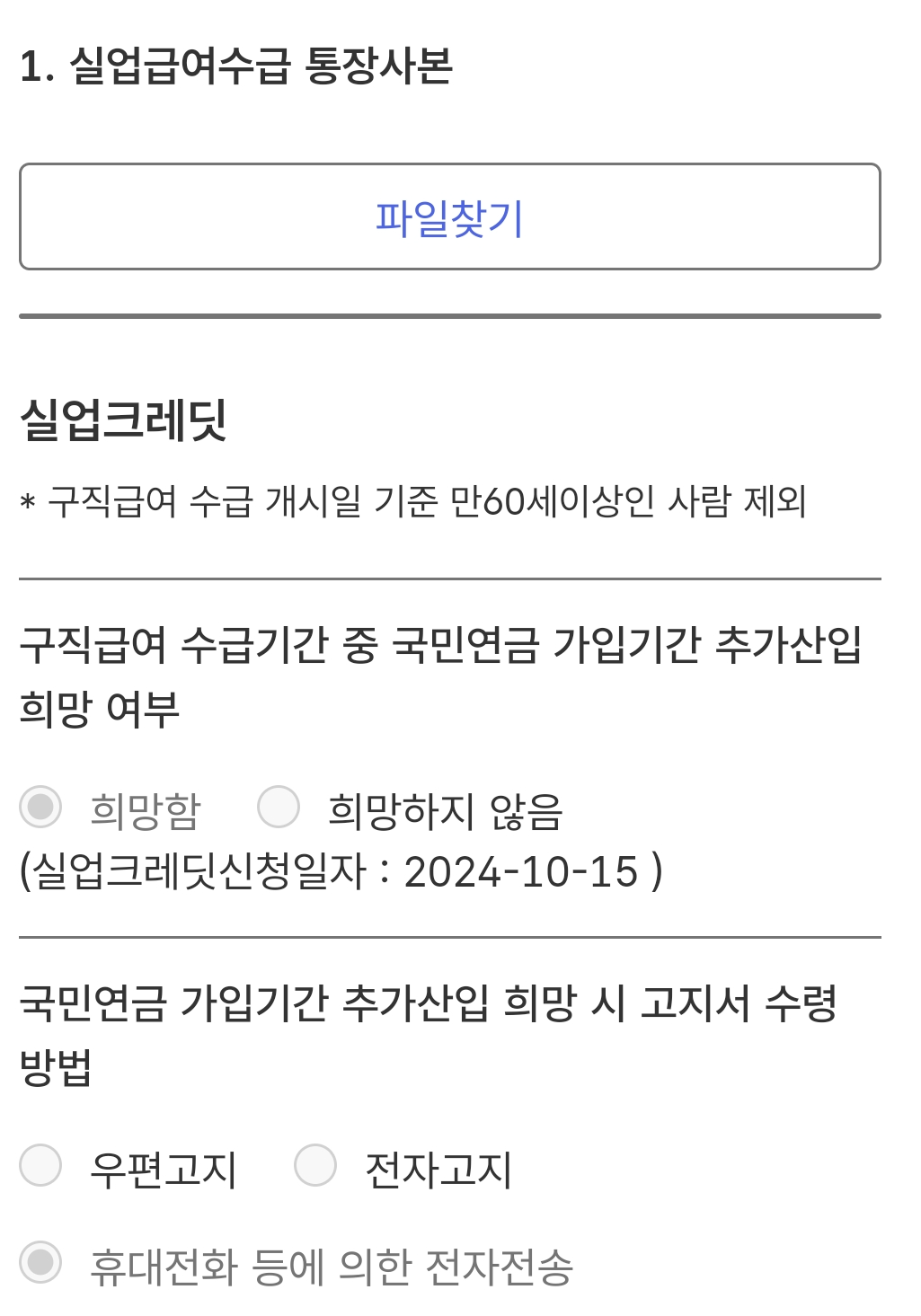 실업크레딧을 희망할 것인지 아닐건지 물어보는데 이는 국민연금을 실업 기간동안 납일할 것인지에 대해 물어보는 것이다.