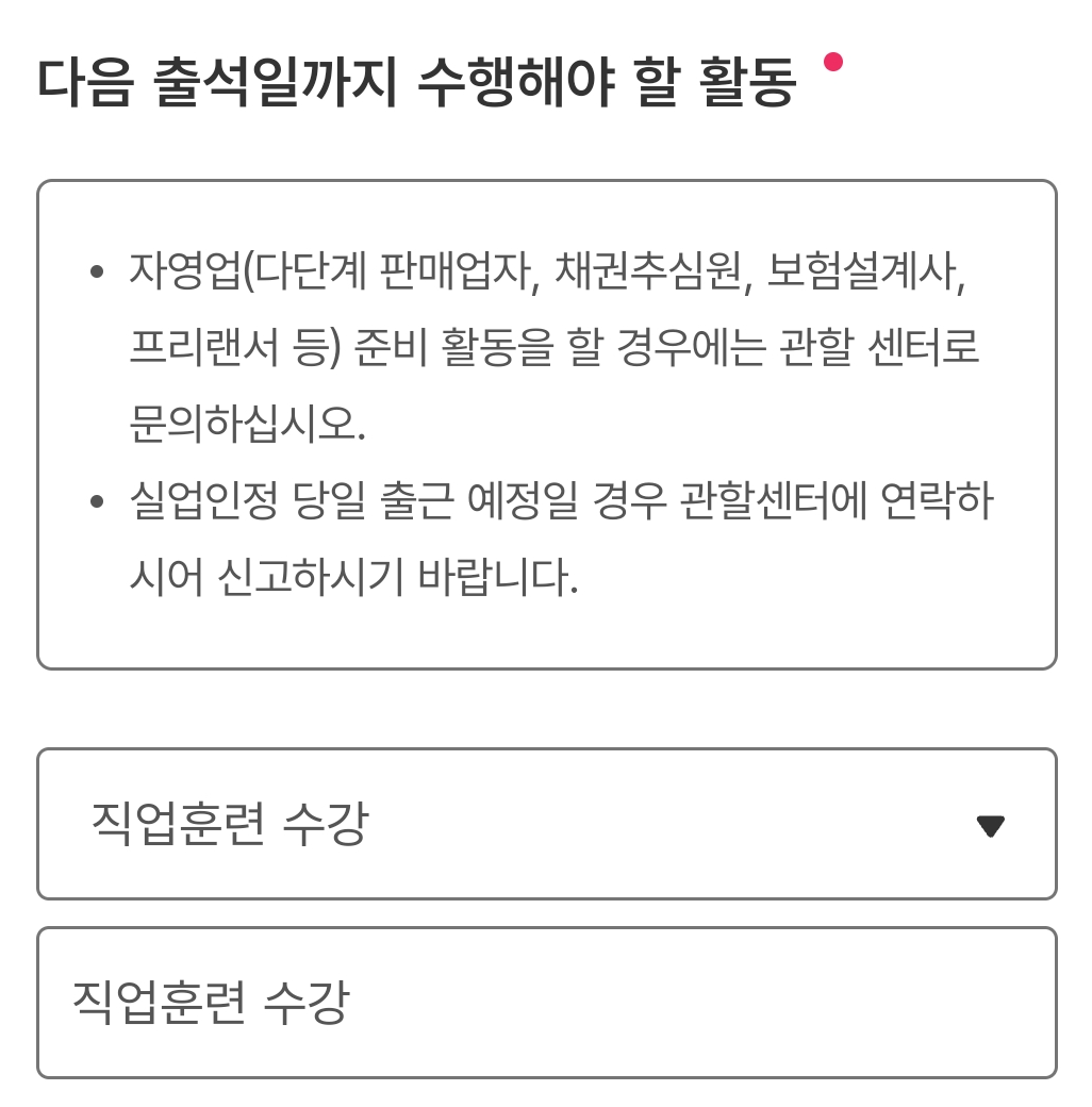 다음 출석일때 뭘 증빙할지는 직업훈련 수강으로 선택하였다.