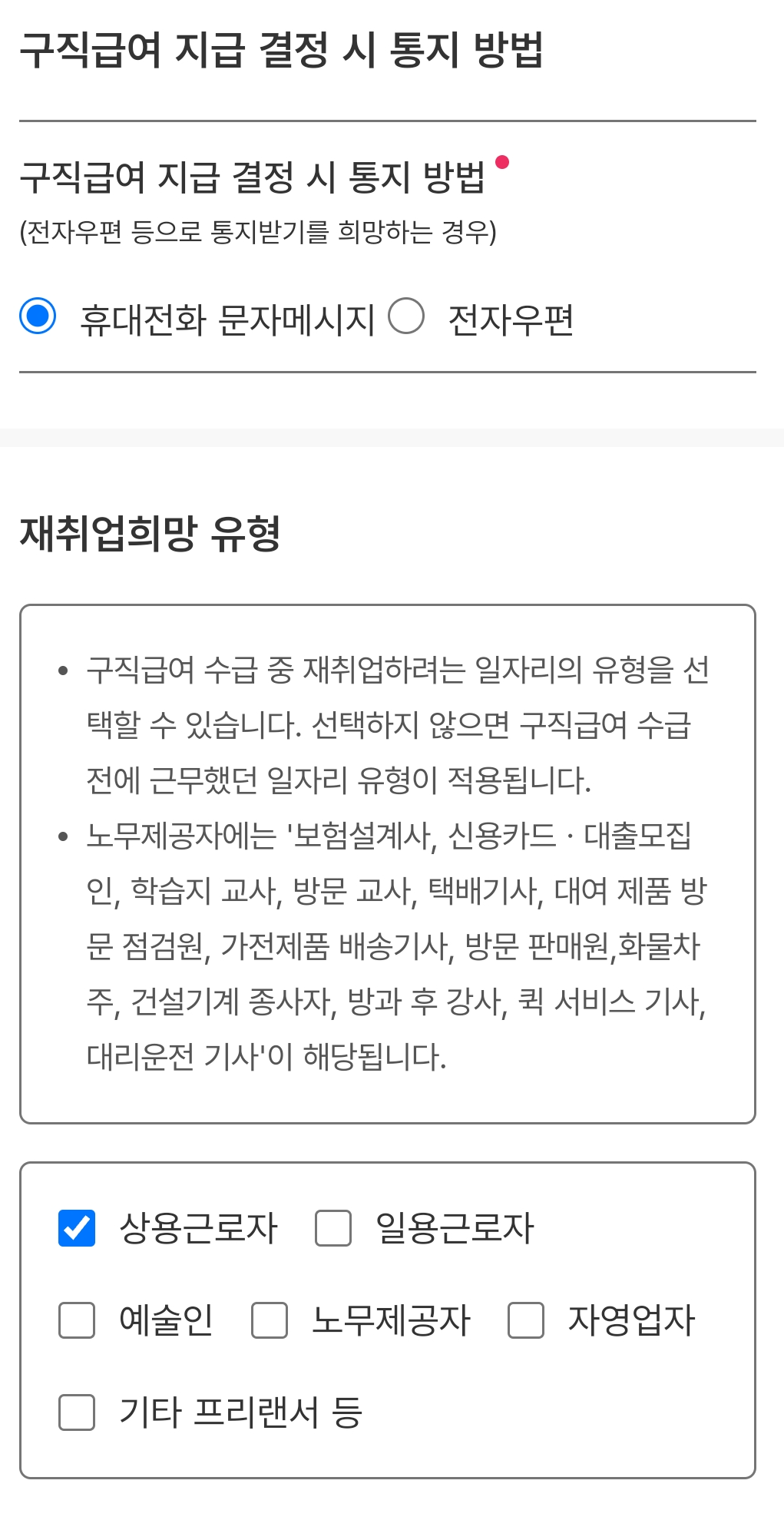 구직급여수령시 문자로 받을지, 메일로 받을지 체크하고