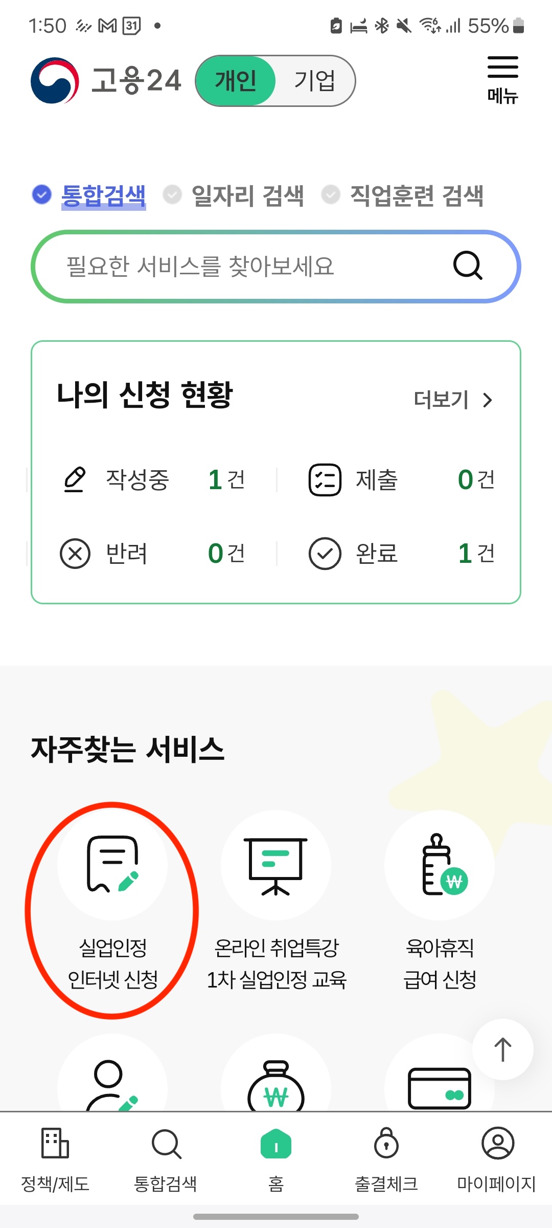 - 고용보험 홈페이지 혹은 모바일 고용24에 접속해 로그인