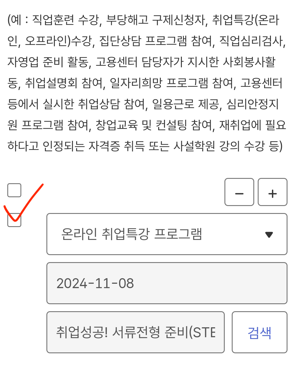 구직 활동 외 활동 사항이 있는 사람(취업특강, 직업훈련 수강, 취업 설명서 참여 등)은 있음에 체크